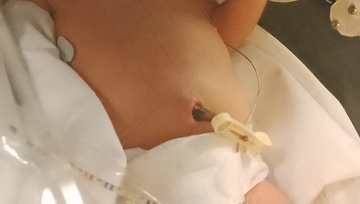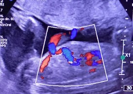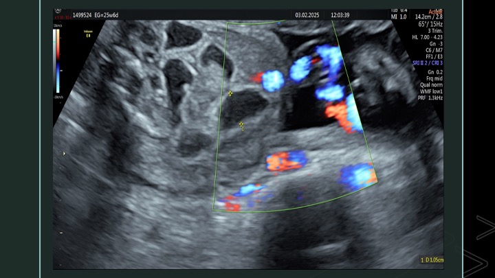 Se presenta el caso de una paciente de 23 años de edad, secundigesta, sin antecedentes personales ni familiares de relevancia. La paciente adjunta el estudio de screening de aneuploidías de la semana 11-14, que arroja bajo riesgo. Las imágenes 1 y 2 describen los hallazgos identificados durante la evaluación de la anatomía fetal en la semana 12. Las imágenes 3, 4 y 5 corresponden a los controles ecográficos posteriores, del segundo y tercer trimestre. La imagen 6 muestra al recién nacido. Seleccione la opción correcta: A. Corresponde a una hernia umbilical fisiológica con resolución más tardía. B. Corresponde a una gastrosquisis con cierre espontáneo intraútero. C. Corresponde a un onfalocele con ruptura del mismo. D. El defecto de pared cerró espontáneamente mejorando el pronóstico y riesgo de complicaciones gastrointestinales. Figura 1: se visualiza corte axial del abdomen fetal, a nivel de la inserción del cordón umbilical, con Doppler color en semana 12. Figura 2: se observa corte axial, a nivel de la inserción del cordón umbilical en la pared abdominal anterior, en semana 12. Figura 3: corte sagital a nivel de la inserción del cordón en la pared abdominal anterior, con Doppler color, en semana 20. Figura 4: corte axial del abdomen fetal, en semana 32, donde se identifica dilatación de las asas intestinales. Figura 5: corte axial del abdomen fetal, en semana 32, donde se identifica dilatación de las asas intestinales, con la utilización del Doppler color. Figura 6: se observa al recién nacido.