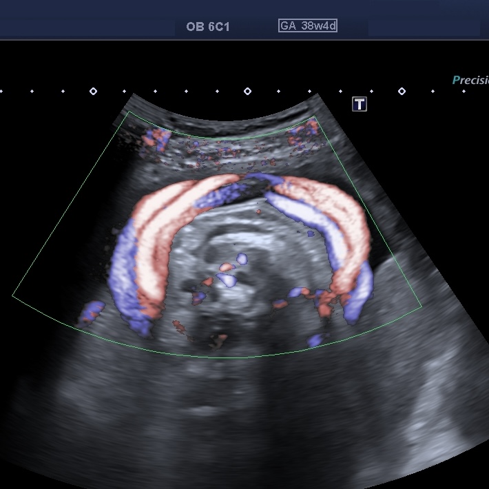 Se presenta el caso de una paciente primigesta, cursando un embarazo de 38 semanas de gestación, sin antecedentes de relevancia. Acude a la consulta para realizar una ecografía obstétrica con Doppler obstétrico. Refiere que, de mantenerse condiciones obstétricas favorables, se planificará un parto domiciliario. Hallazgos ecográficos: ? Feto único vivo, en presentación cefálica. ? Biometría acorde a la edad gestacional. ? Líquido amniótico dentro de parámetros normales. ? Placenta normoinserta. ? Doppler obstétrico dentro de rangos normales en todos los trayectos estudiados. A nivel del cuello fetal se observa las siguientes imágenes: Ante este hallazgo ecográfico usted: A) Interpreta doble circular de cordón y no la describe en el informe, ya que su presencia antenatal no modifica la conducta obstétrica ni predice por sí sola resultados adversos. B) Describe la doble circular de cordón umbilical como hallazgo ecográfico objetivo, especificando método diagnóstico, sin emitir recomendaciones obstétricas adicionales. C) Describe el hallazgo como circular de cordón múltiple e indica en el informe sugerencia de finalización institucional del embarazo debido al potencial riesgo intraparto.