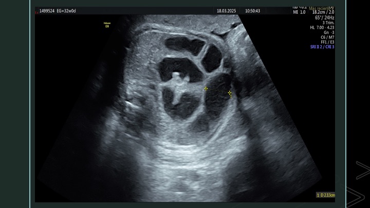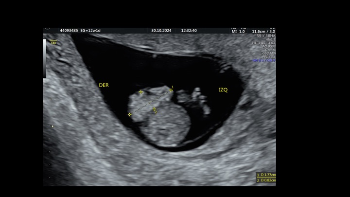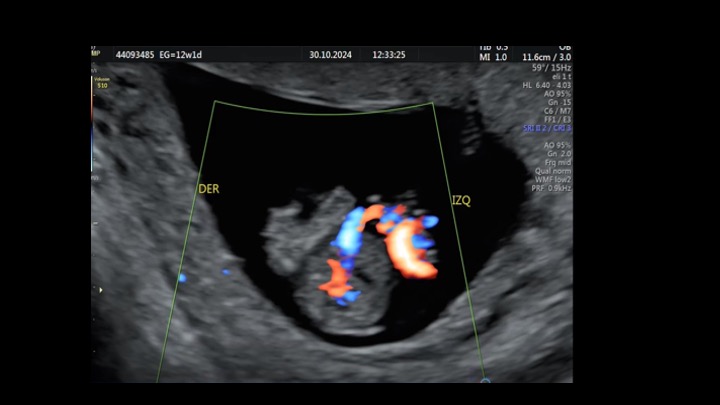 Se presenta el caso de una paciente de 23 años de edad, secundigesta, sin antecedentes personales ni familiares de relevancia. La paciente adjunta el estudio de screening de aneuploidías de la semana 11-14, que arroja bajo riesgo. Las imágenes 1 y 2 describen los hallazgos identificados durante la evaluación de la anatomía fetal en la semana 12. Las imágenes 3, 4 y 5 corresponden a los controles ecográficos posteriores, del segundo y tercer trimestre. La imagen 6 muestra al recién nacido. Seleccione la opción correcta: A. Corresponde a una hernia umbilical fisiológica con resolución más tardía. B. Corresponde a una gastrosquisis con cierre espontáneo intraútero. C. Corresponde a un onfalocele con ruptura del mismo. D. El defecto de pared cerró espontáneamente mejorando el pronóstico y riesgo de complicaciones gastrointestinales. Figura 1: se visualiza corte axial del abdomen fetal, a nivel de la inserción del cordón umbilical, con Doppler color en semana 12. Figura 2: se observa corte axial, a nivel de la inserción del cordón umbilical en la pared abdominal anterior, en semana 12. Figura 3: corte sagital a nivel de la inserción del cordón en la pared abdominal anterior, con Doppler color, en semana 20. Figura 4: corte axial del abdomen fetal, en semana 32, donde se identifica dilatación de las asas intestinales. Figura 5: corte axial del abdomen fetal, en semana 32, donde se identifica dilatación de las asas intestinales, con la utilización del Doppler color. Figura 6: se observa al recién nacido.
