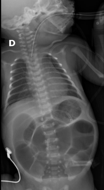 A partir de ese momento se realizó un seguimiento ecográfico exhaustivo, evidenciándose una dilatación progresiva del intestino intra-abdominal, entre 10.5 mm en semana 25 (Figura 4) a 26.5 mm en semana 34, siempre con aparente indemnidad de la pared abdominal (Figura 5). La progresión biométrica fue acorde a la edad gestacional, con Doppler fetoplacentario y valoraciones de líquido amniótico normales. En el último control ecográfico de la semana 34, el equipo de obstetricia, en conjunto con neonatología, deciden la finalización del embarazo por cesárea abdominal. El recién nacido fue de sexo masculino, con un peso de 2760 gs, adecuado para la edad gestacional, Apgar 6/8, y al examen físico presentó indemnidad de la pared abdominal anterior (Figura 6). Se realiza una ecografía abdominal y radiografía de abdomen, confirmando la dilatación intestinal generalizada (Figura 7). A las 72 horas de vida, se realiza laparotomía exploradora donde se identifican asas intestinales obstruidas a nivel de íleon y colon derecho por lo que se procede a la resección de las mismas con reconstrucción del tránsito mediante la anastomosis yeyuno colónica término-lateral y yeyunostomía en fosa ilíaca derecha. Actualmente, se encuentra en seguimiento por servicio de cirugía y gastroenterología pediátrica.